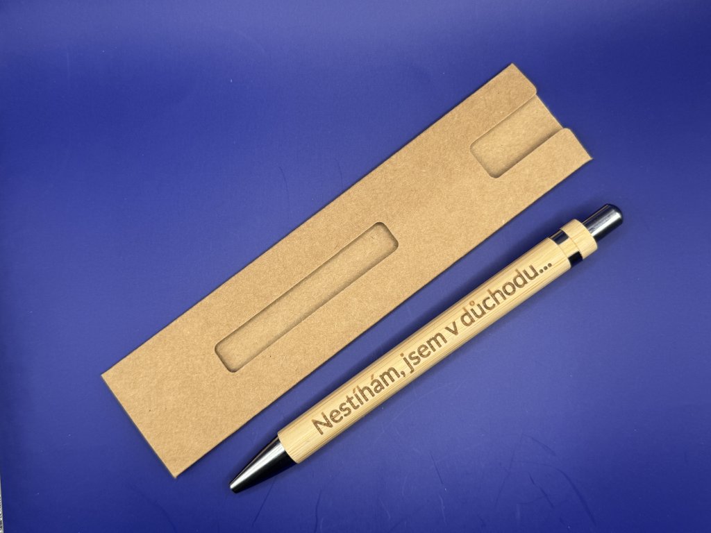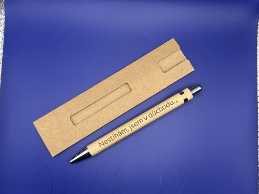 Bambusová propisovací tužka s nápisem: Nestíhám, jsem v důchodu...