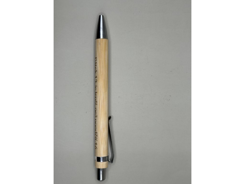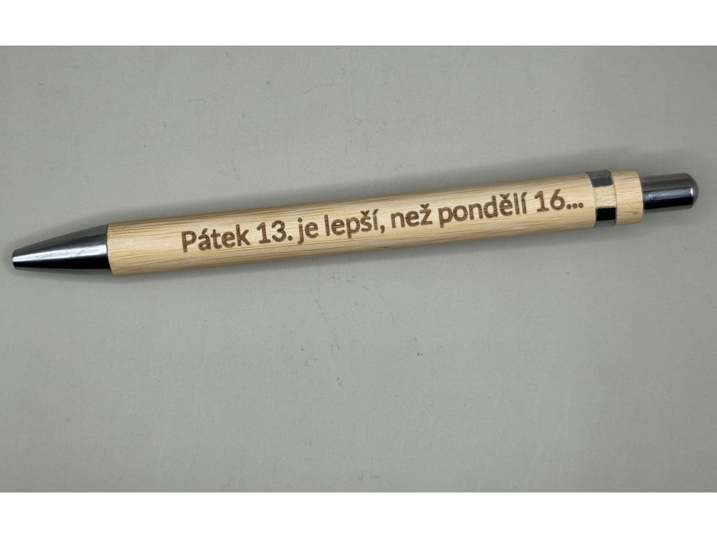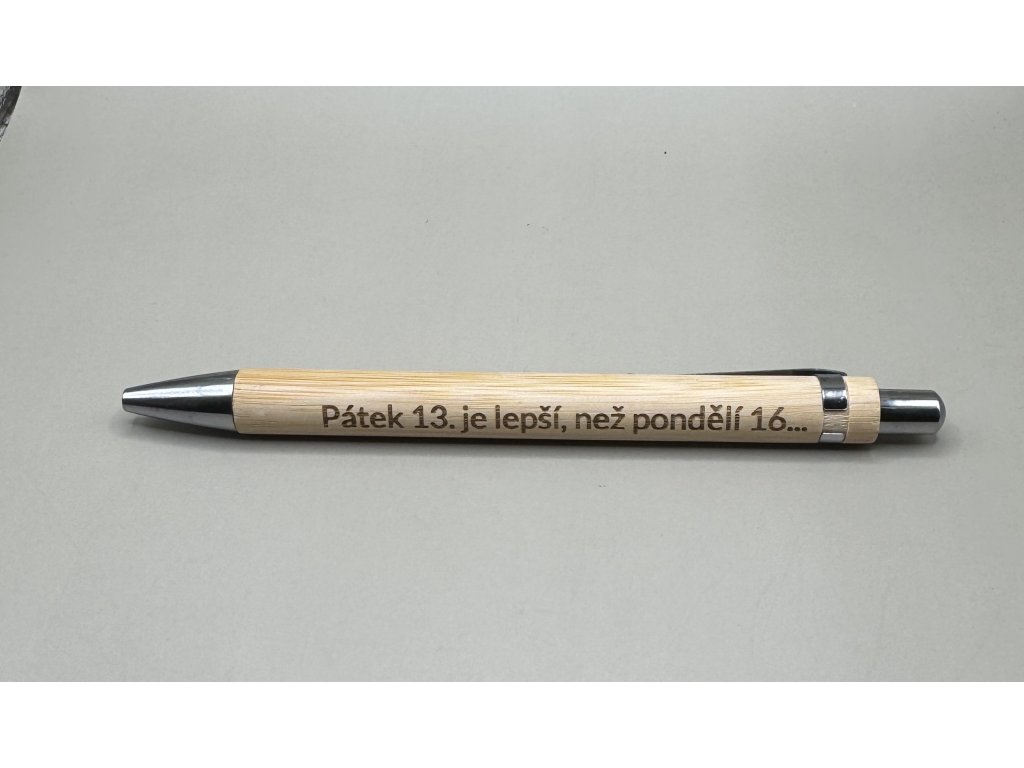 Bambusová propisovací tužka s nápisem: "Pátek 13. je lepší, než pondělí 16...