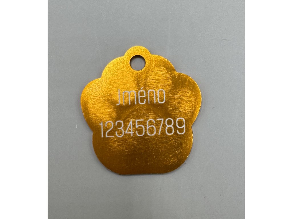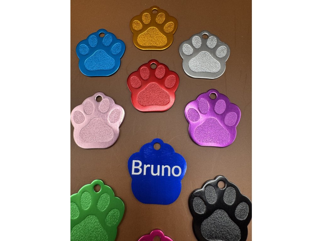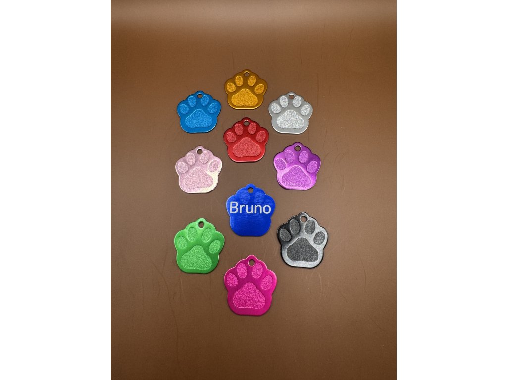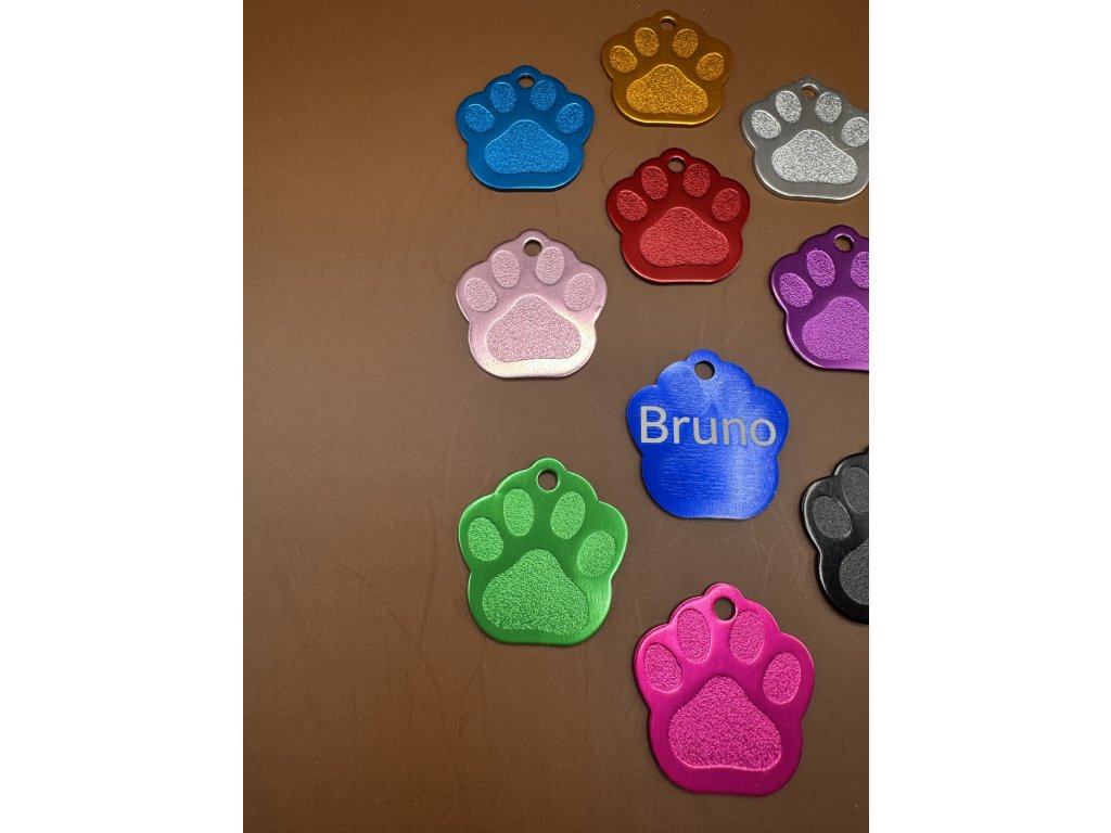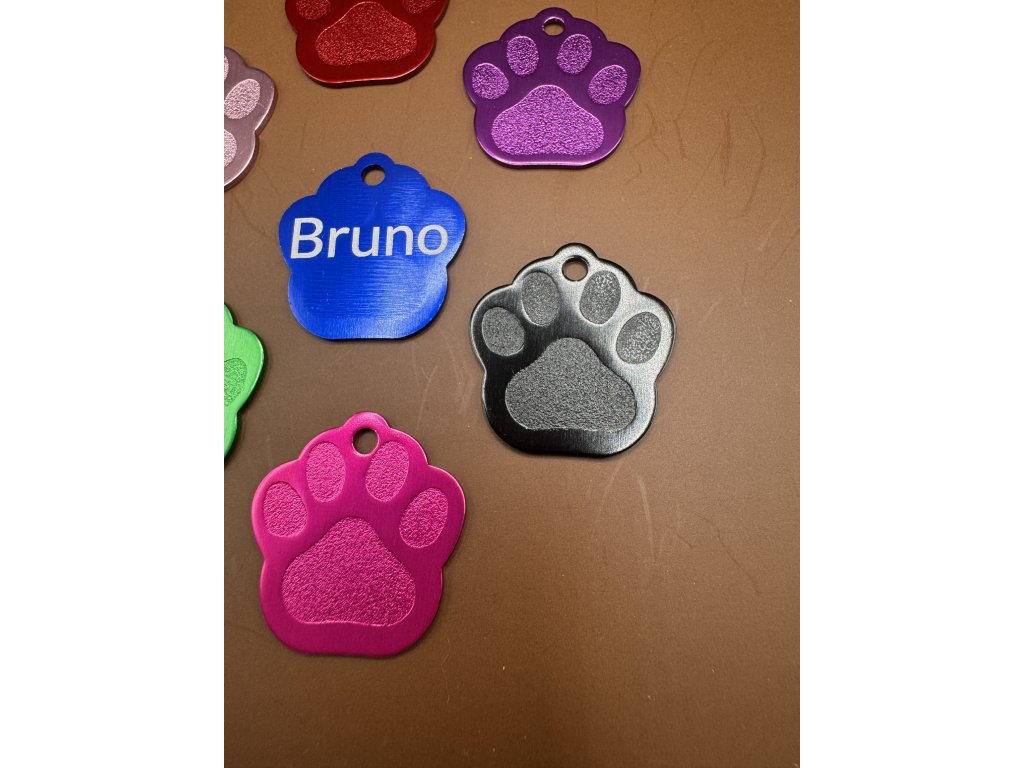 Můžete vybrat personalizaci - gravírování textu z jedné strany. Jedna strana má plastické vytlačení tlapky.